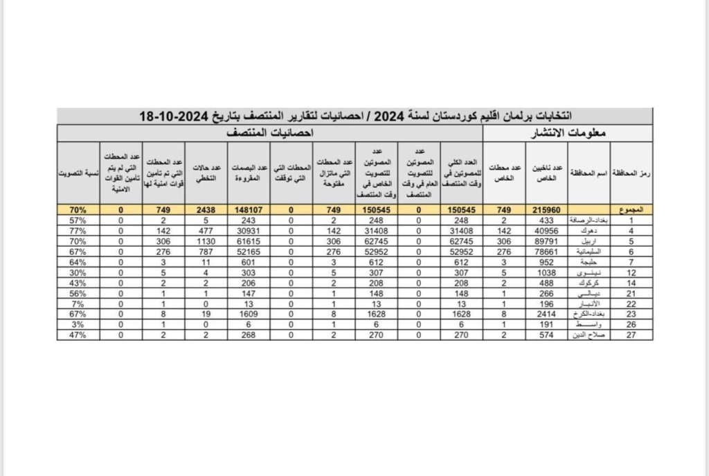 وأوضحت المفوضية أن العملية الانتخابية تسير بشكل سلس ومنتظم، دون تسجيل أي معوقات كبيرة قد تؤثر على سير الانتخابات. وتهدف هذه الإحصائيات إلى تعزيز الثقة بين الناخبين وضمان شفافية العملية برمتها، ما يساهم في إنجاح الانتخابات البرلمانية في الإقليم.