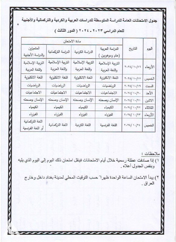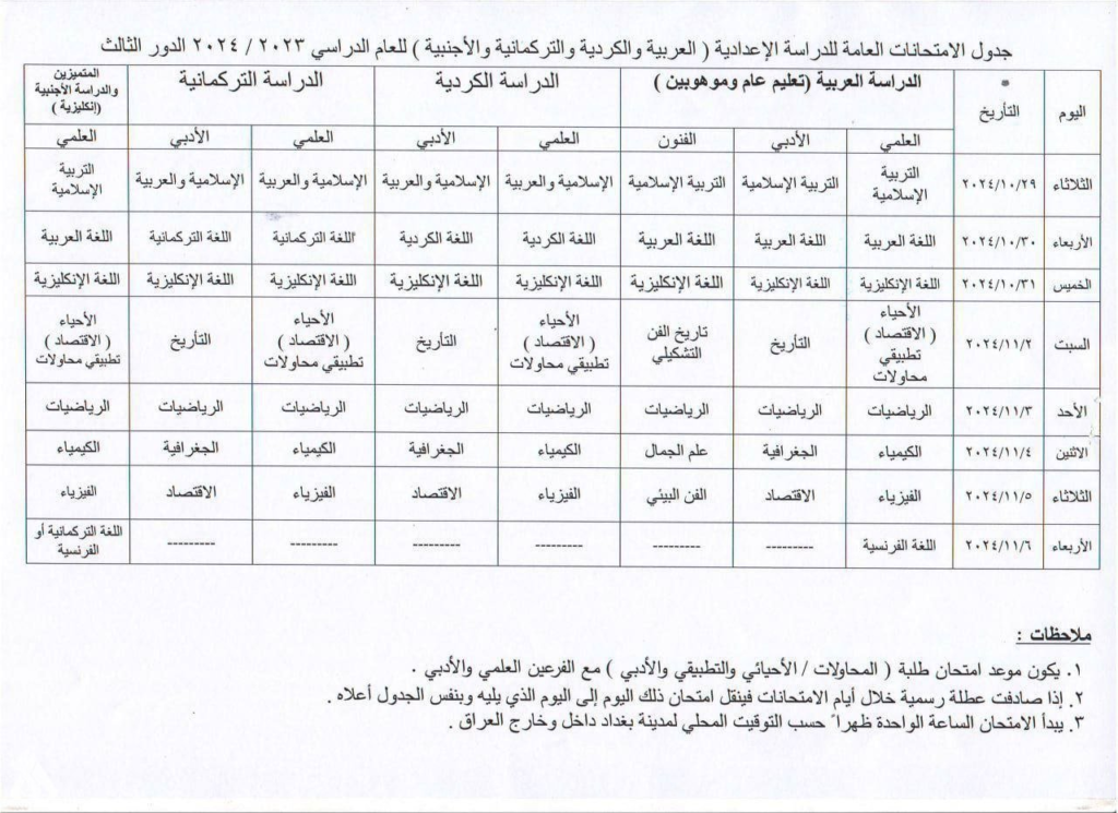 جدول امتحانات الدور الثالث لطلبة الثالث المتوسط والسادس الإعدادي يُعلن رسميًا