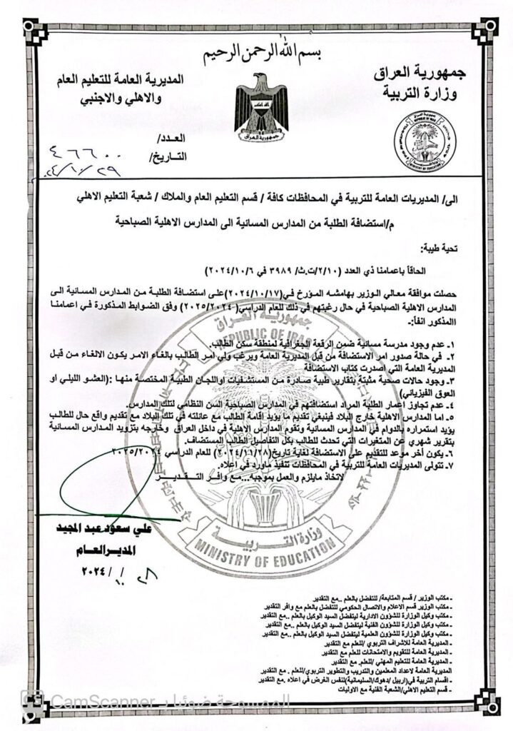 أصدرت وزارة التربية العراقية، اليوم الثلاثاء، قراراً هاماً يسمح لطلاب المدارس المسائية بالالتحاق بالمدارس الأهلية الصباحية للعام الدراسي المقبل 2024-2025.