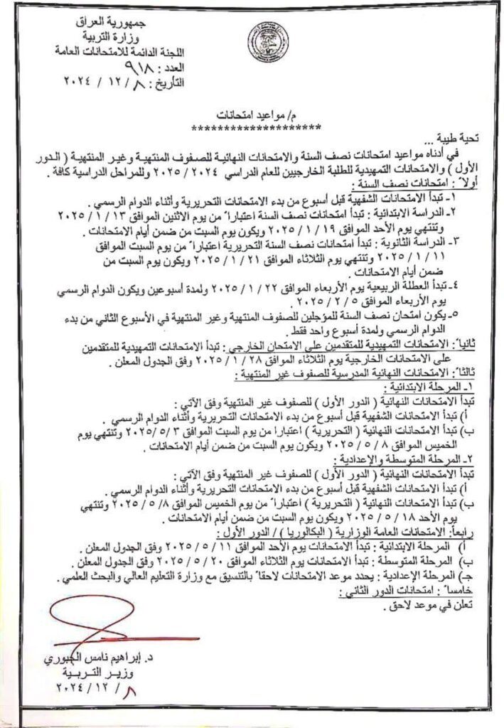 أصدرت وزارة التربية العراقية، يوم الأحد، بياناً رسمياً يحدد فيه مواعيد امتحانات نصف السنة الدراسية والامتحانات النهائية لجميع المراحل الدراسية، شاملاً الصفوف الدراسية المنتهية وغير المنتهية.