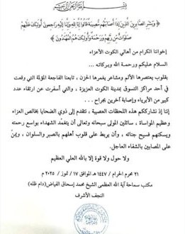 مكتب المرجع الديني الشيخ الفياض يعزي بضحايا حادثة مركز التسوق في الكوت
