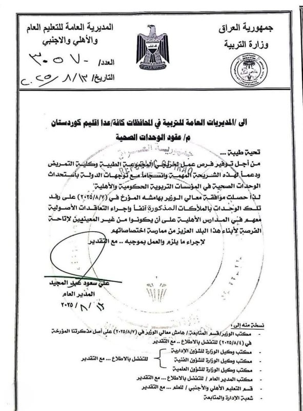وجه وزير التربية إبراهيم الجبوري توجيهات جديدة اليوم الأربعاء. طلب الوزير إجراء تعاقدات أصولية مع الخريجين الطبيين.