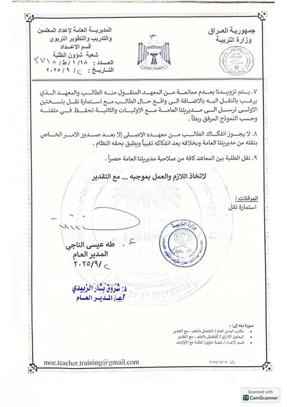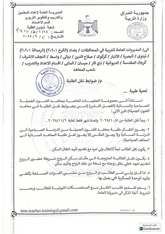 وبين البيان أن جميع عمليات النقل تتم حصرياً عبر المديرية العامة لإعداد المعلمين. وأكد ضرورة تقديم طلب النقل مع المستمسكات الثبوتية إلى المديرية مباشرة. أخيراً، شدد على عدم قبول أي طلبات من خلال جهات أخرى.