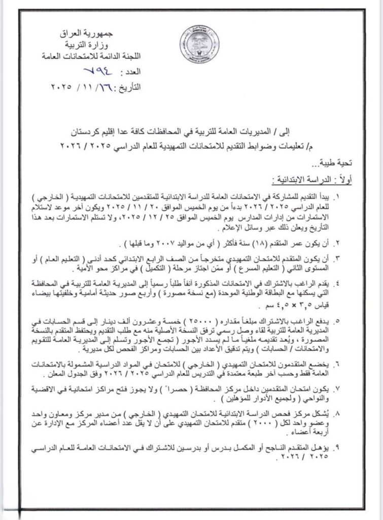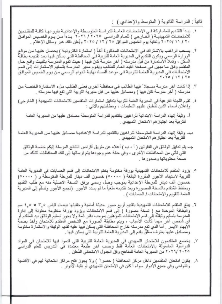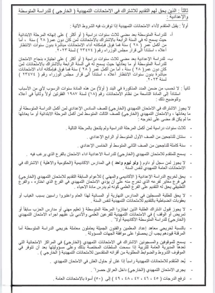اشترطت الوزارة لدخول امتحانات المرحلة الإعدادية إنهاء الدراسة المتوسطة. يجب على المتقدم إكمال المرحلة المتوسطة أو ما يعادلها بنجاح.