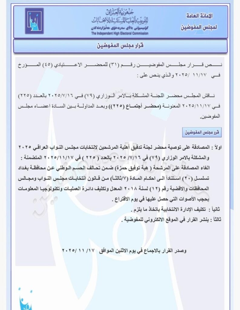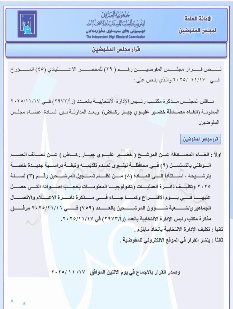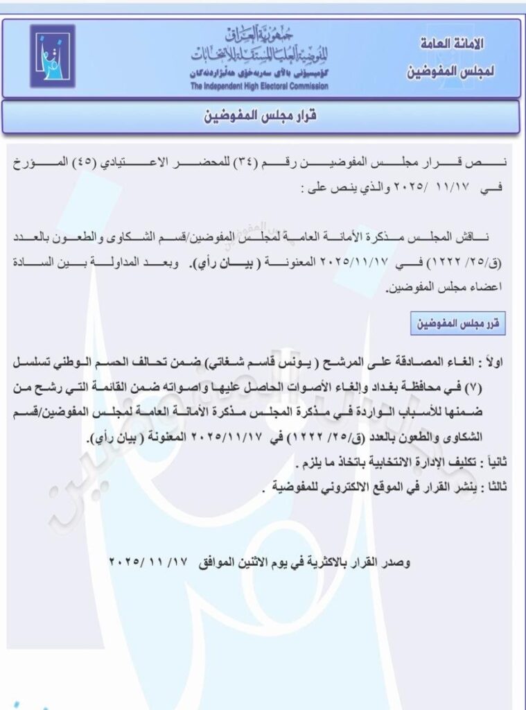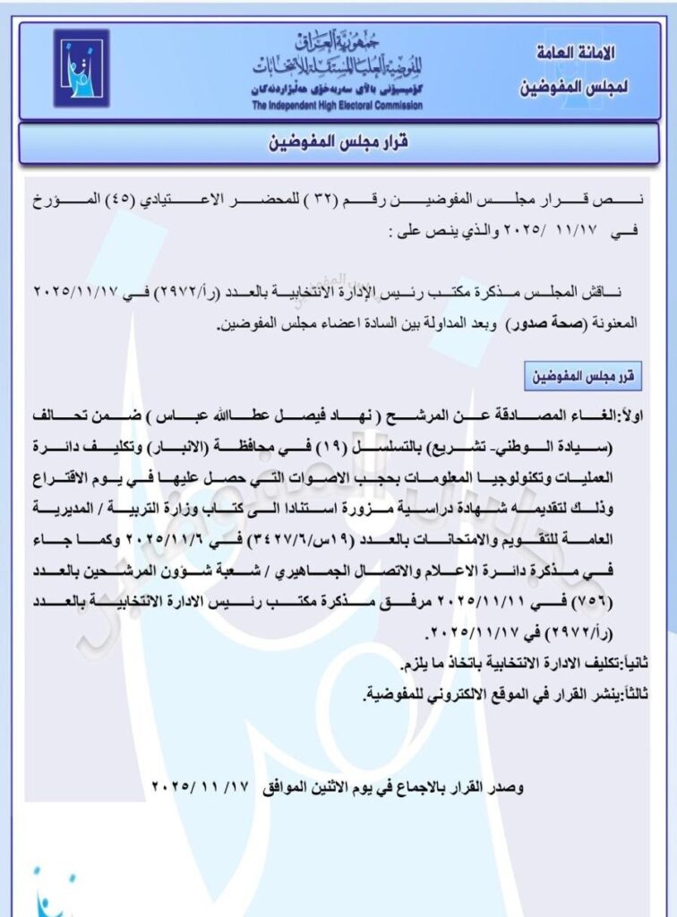 أعلنت المفوضية العليا المستقلة للانتخابات اليوم الاثنين قراراً مهماً يقضي بإلغاء المصادقة عن عدد من المرشحين في الانتخابات النيابية. كما قررت حجب جميع الأصوات التي حصل عليها هؤلاء المرشحون.