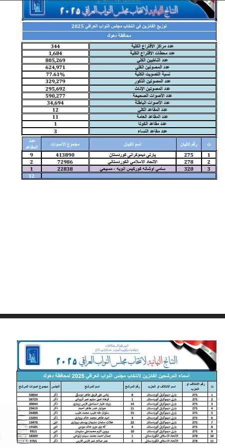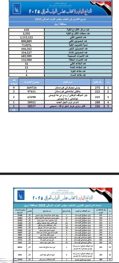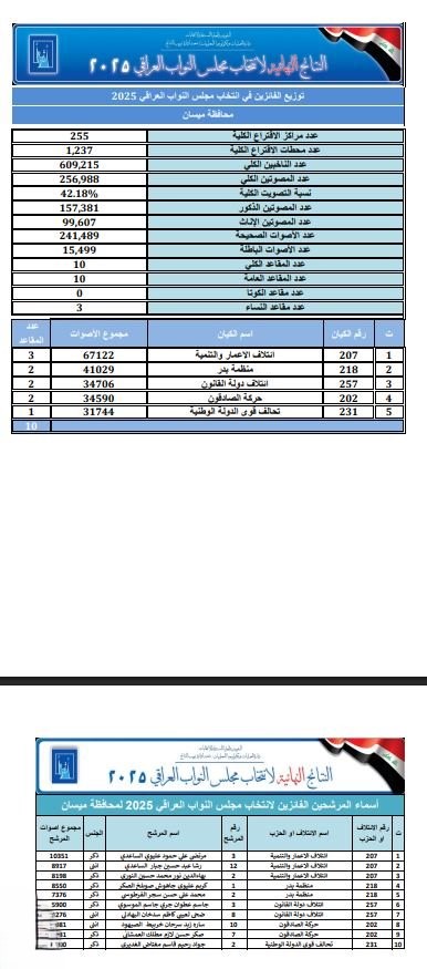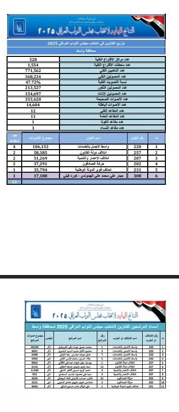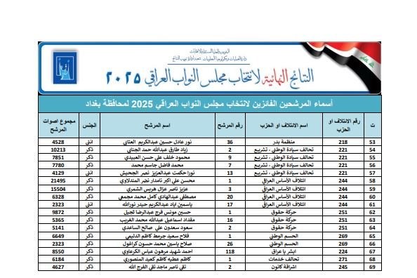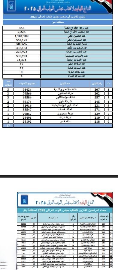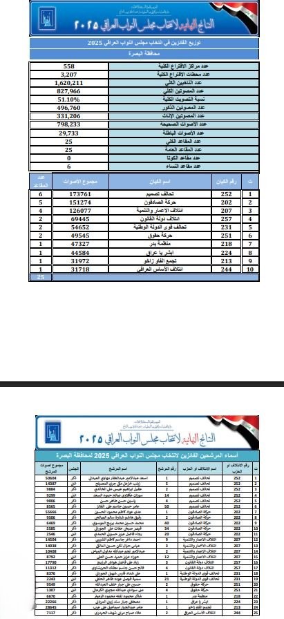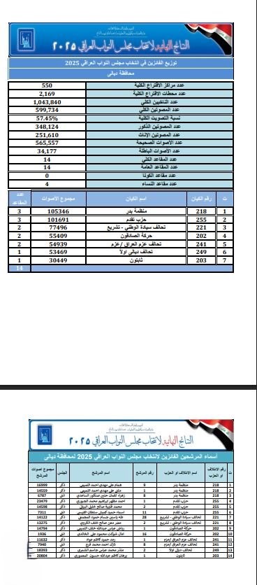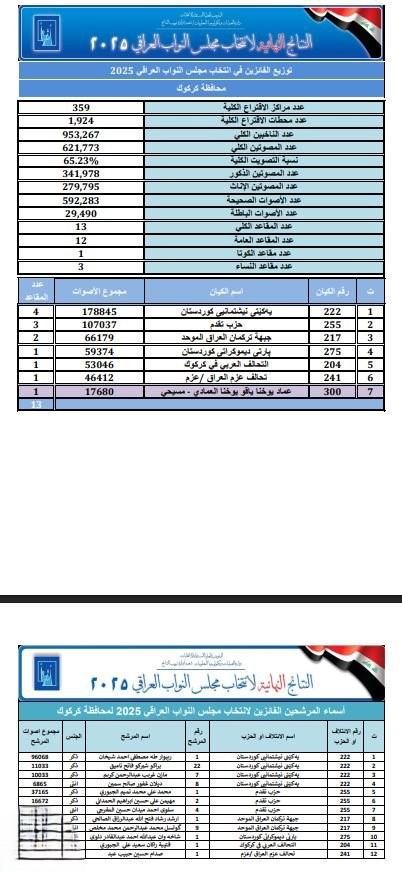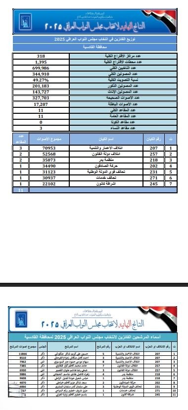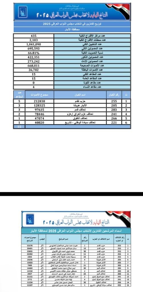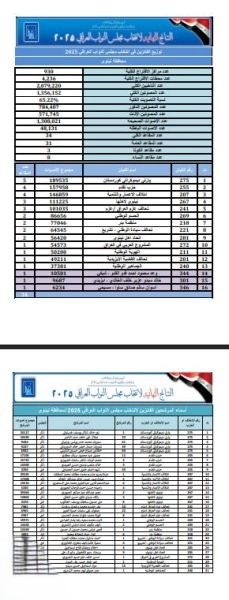 أعلنت المفوضية العليا للانتخابات النتائج النهائية لانتخابات مجلس النواب العراقي لعام 2025. تم الإعلان عن هذه النتائج خلال مؤتمر صحفي رسمي عقد في بغداد.