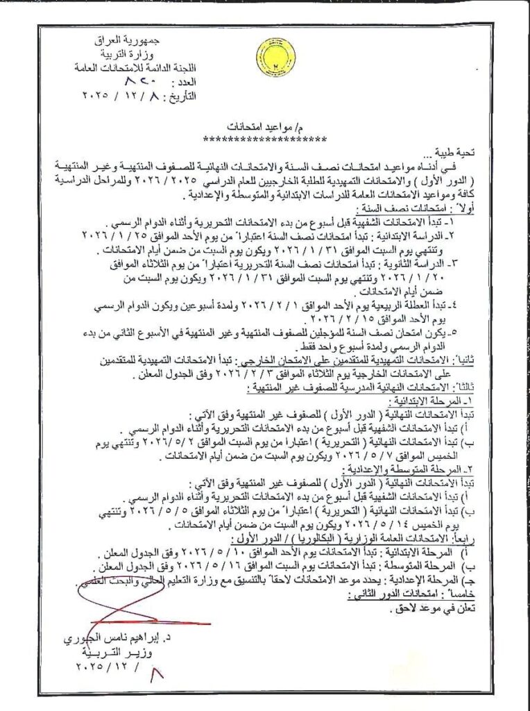 أعلنت وزارة التربية العراقية اليوم الاثنين جدول مواعيد الامتحانات الرسمية لجميع المراحل الدراسية. تشمل هذه المواعيد امتحانات نصف السنة والامتحانات النهائية للعام الدراسي 2025-2026.
