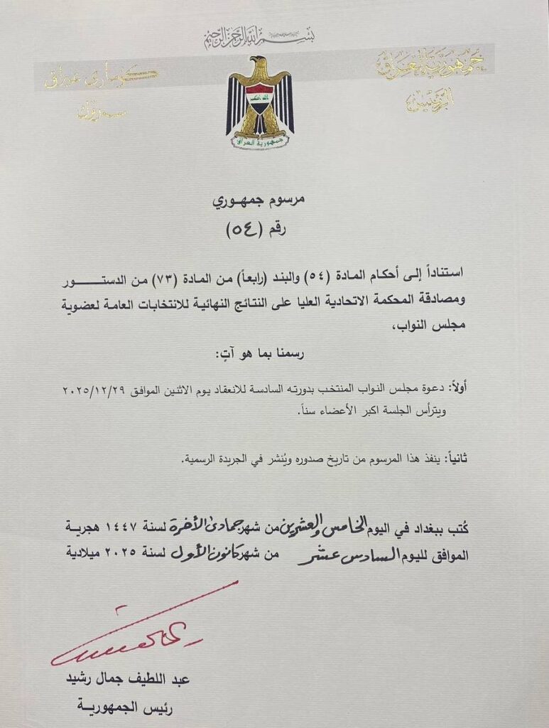 رئيس الجمهورية العراقي يحدد 29 ديسمبر موعداً رسمياً لانعقاد البرلمان الجديد