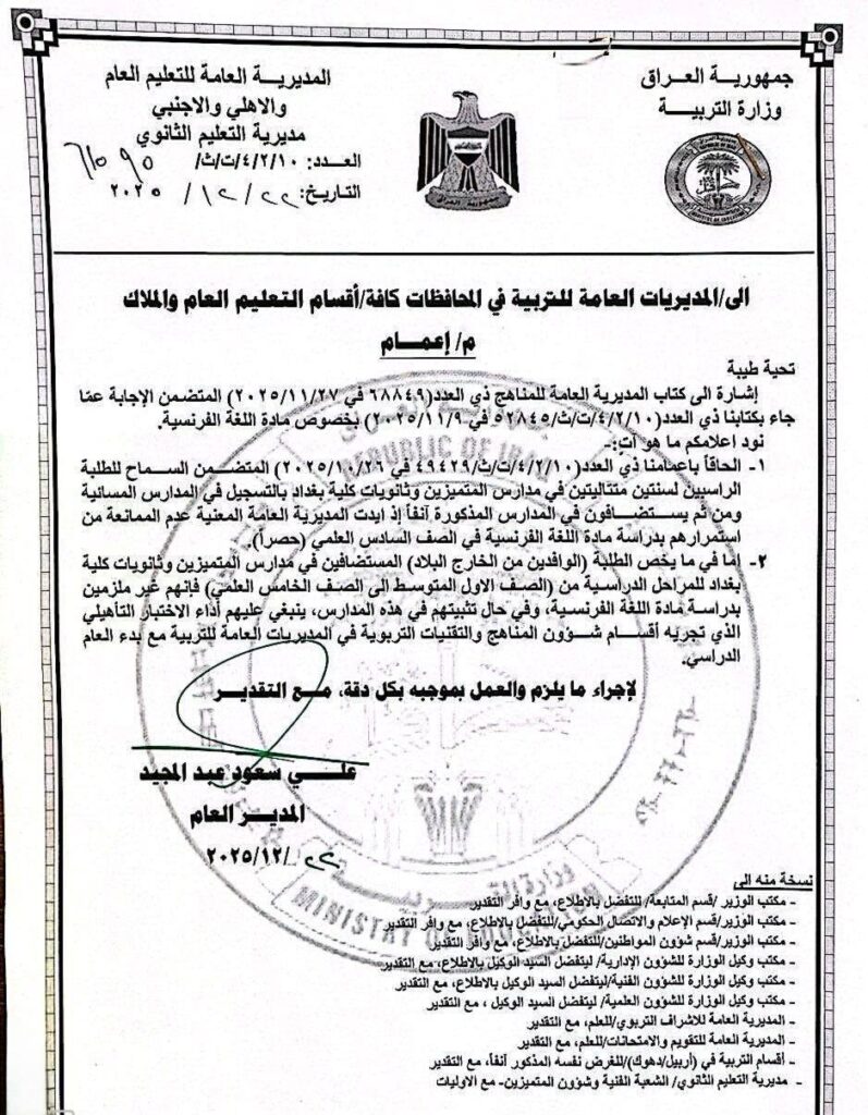 أعلنت وزارة التربية العراقية اليوم الأربعاء قراراً جديداً يخص الطلبة الراسبين في المدارس المتميزة. ويشمل هذا القرار أيضاً طلبة ثانويات كلية بغداد. علاوة على ذلك، يركز القرار على حالات محددة من الرسوب.