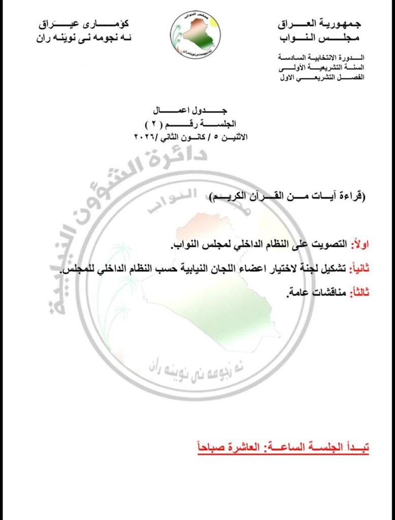 أعلن مجلس النواب العراقي، اليوم السبت، جدول أعماله للجلسة المقررة يوم الإثنين المقبل. بالإضافة إلى ذلك، حدد المجلس ثلاث فقرات رئيسية ستناقش خلال هذه الجلسة.