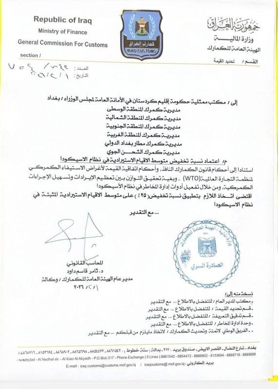 الجمارك العراقية تعلن تخفيضاً بنسبة 25% على القيم الاستيرادية لتسهيل التجارة
