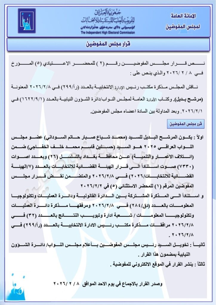 أصدرت المفوضية العليا المستقلة للانتخابات، اليوم الأحد، قراراً رسمياً بشأن استبدال عضو البرلمان. وبناءً على هذا القرار، سيحل المرشح الفائز حسنين الخفاجي محل المرشح الفائز محمد شياع السوداني في مجلس النواب العراقي.