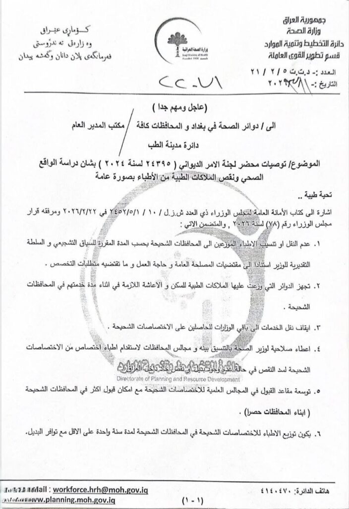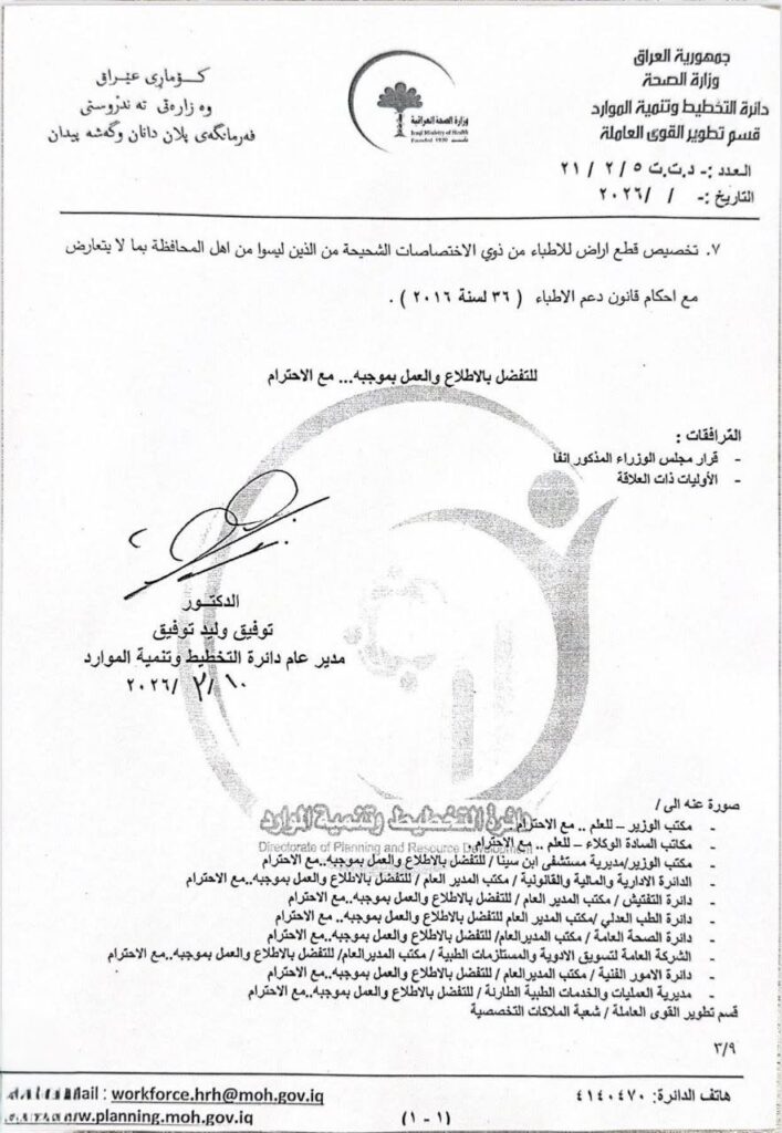 خطة وزارة الصحة العراقية لحل أزمة نقص الأطباء والملاكات الطبية