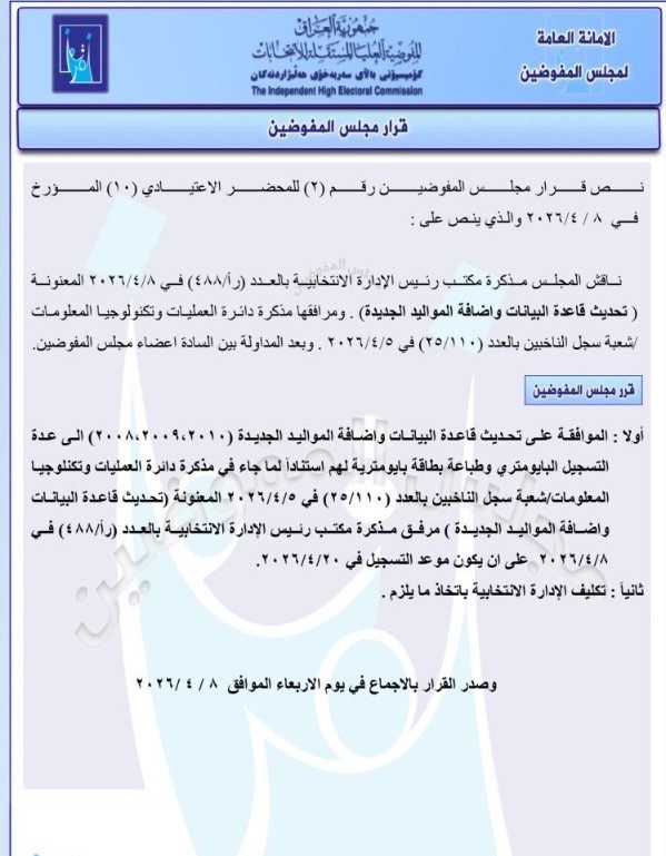 ناقش مجلس المفوضين مذكرة رسمية من مكتب رئيس الإدارة الانتخابية بتاريخ 8 أبريل 2026. حملت المذكرة رقم (رأ/488) وعنوان تحديث قاعدة البيانات وإضافة المواليد الجديدة.