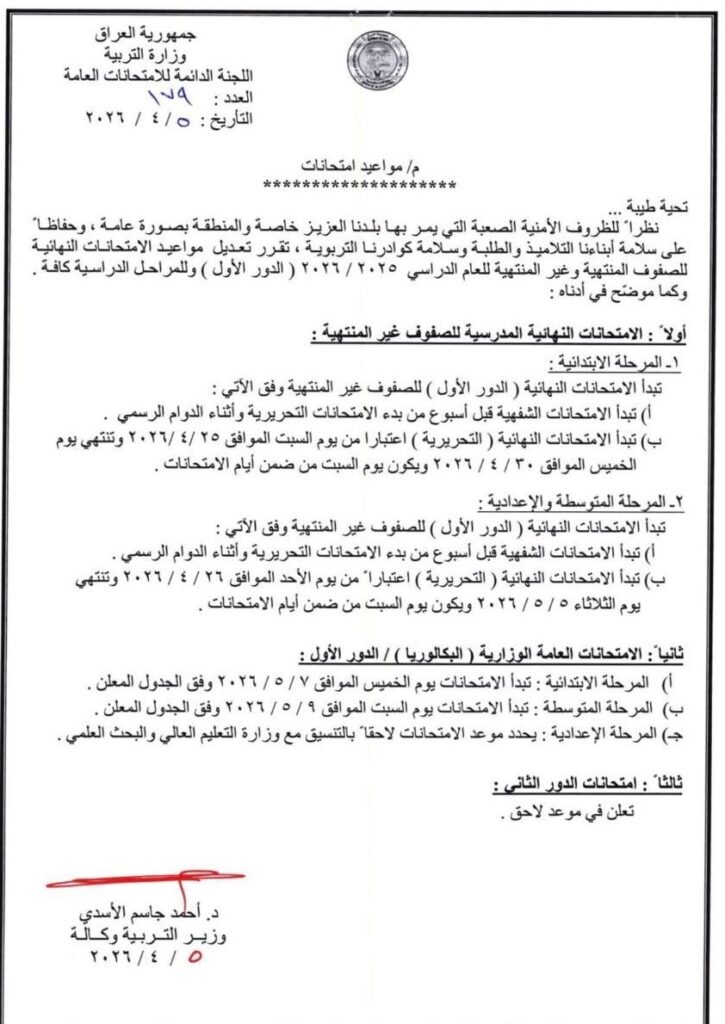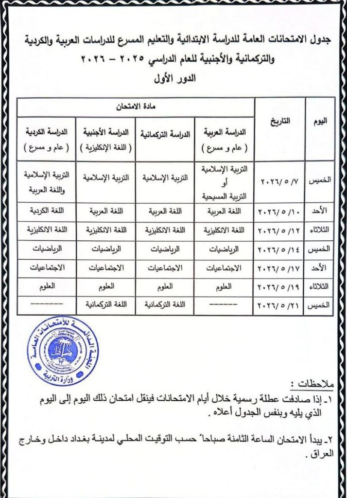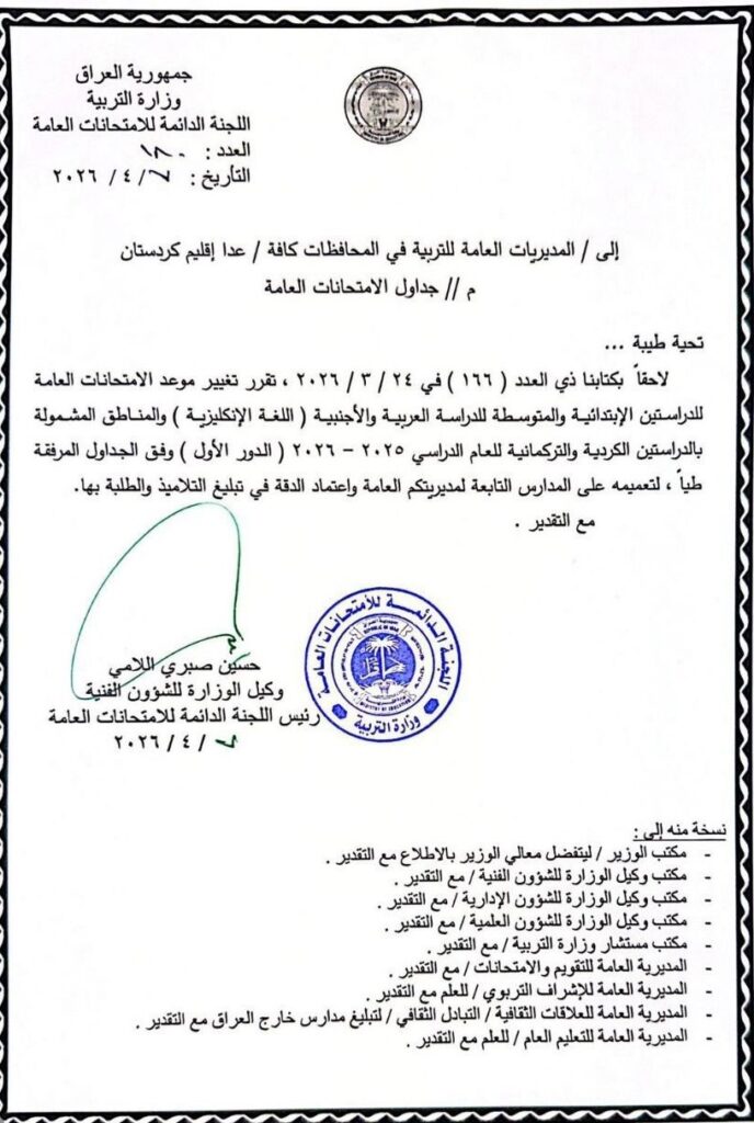 أعلنت وزارة التربية العراقية جداول امتحانات العام الدراسي 2025-2026 اليوم الثلاثاء. كما جاء هذا الإعلان بعد اجتماع هيئة الرأي التي عُقد يوم الاثنين.