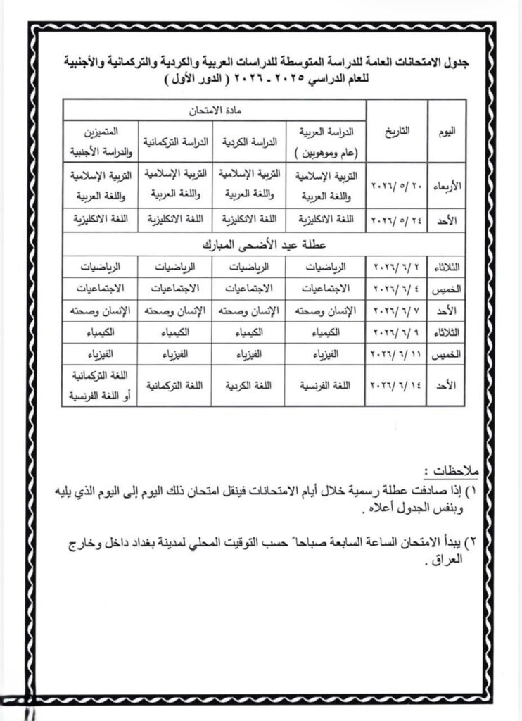 وكالة الأنباء العراقية تنشر الجداول المحدثة لامتحانات العام الدراسي 2025-2026