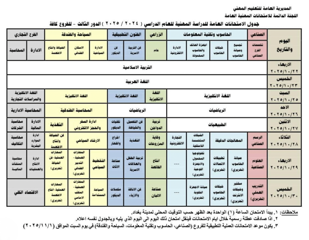 نشرت المديرية العامة للتعليم المهني التابعة لوزارة التربية العراقية اليوم الخميس جدول الامتحانات العامة للدراسة المهنية. يخص هذا الجدول امتحانات الدور الثالث للعام الدراسي الحالي 2024-2025.
